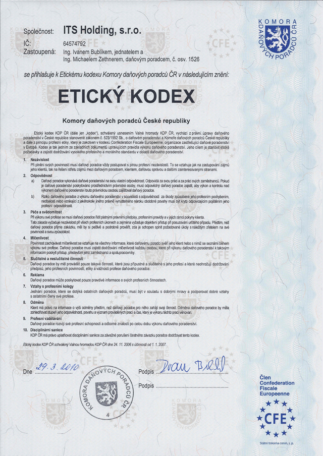 Naše společnost má statut daňového poradce a dodržujeme etický kodex daňového poradce. Jsme pojištěni proti možným škodám v procesu vracení zahraniční DPH a to až do výše 5.000.000,- CZK. U nás máte skutečnou jistotu, že obdržíte maximum z Vašeho nároku na vrácení zahraniční DPH.